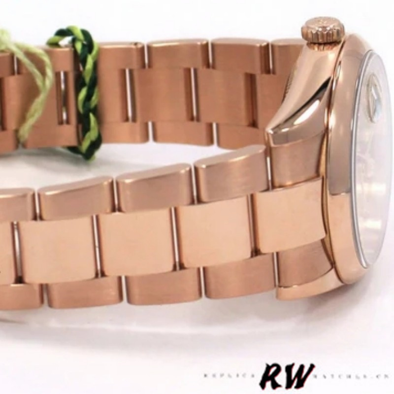 Rolex Day-Date 118205 Rose Gold Pink Diamond Dial 36mm Unisex Replica Watch. 36mm rose gold oyster case in diameter featuring a pink diamond dot dial housing an external Cyclops date aperture at 3 O'clock and a day aperture in-between 11 and 1 O'clock. The dial is surrounded by a rose gold domed bezel and the watch comes on a full retail length rose gold Rolex President bracelet.