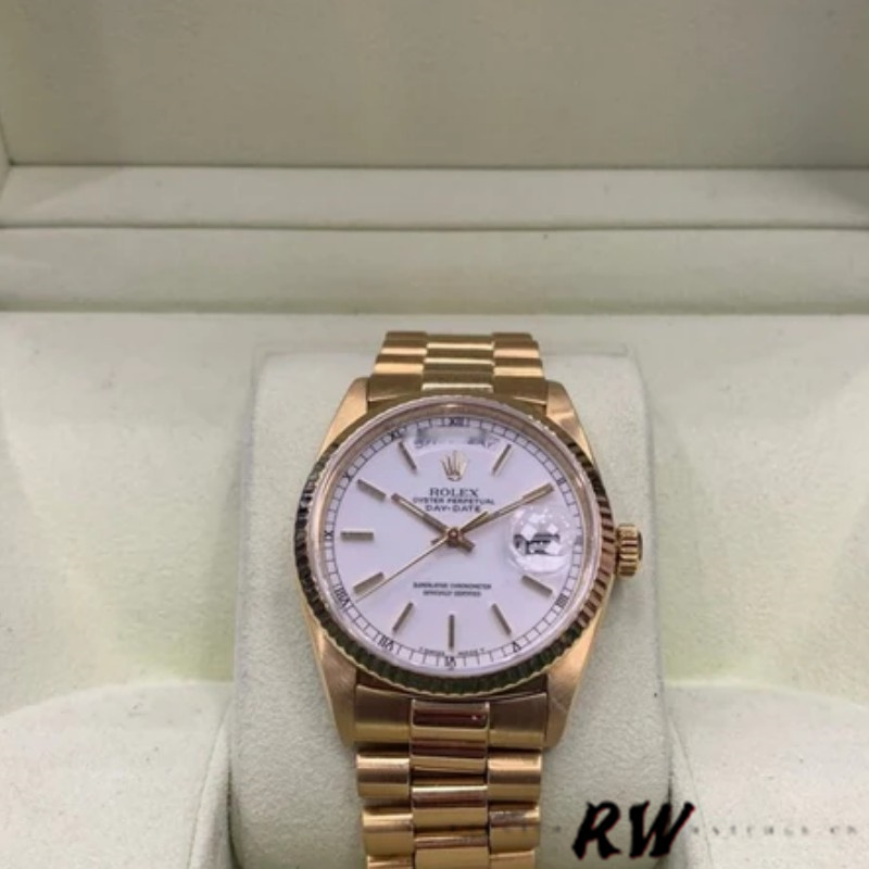 Rolex Day-Date 118235 White Dial 36mm Unisex Replica Watch has a Rose Gold 36 mm Round Case with Screw Down Crown and a Rose Gold Fluted Bezel. white dial With Manufacturer Serial Numbers. The day at the 12 o'clock and the date at the 3 o'clock.Rose Gold President Bracelet with the heavy band Folding Crownclasp.