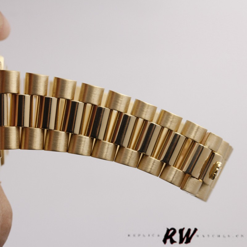 Rolex Day-Date 118238 Ivory Dial Fluted Bezel 36mm Unisex Replica Watch has a Yellow Gold 36 mm Round Case with Screw Down Crown and a Yellow Gold Fluted Bezel. Roman Numeral Pyramid Ivory Dial With Manufacturer Serial Numbers,and day and date display at 12 and 3 o'clock. Scratch resistant sapphire crystal. Screw down crown.The reliable Yellow Gold Oyster Bracelet will look great on your wrist.