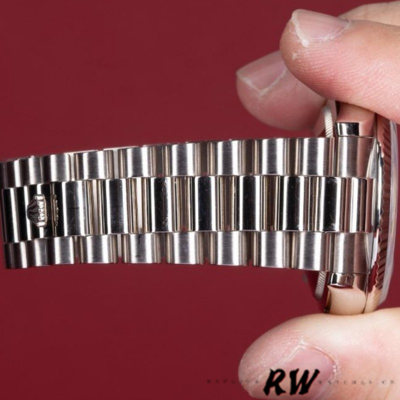 Rolex Day-Date 118239 Chocolate Brown Dial 36mm Unisex Replica Watch. 36mm white gold case with white gold fluted bezel.Chocolate Brown Dial with Roman Numerals, Date display at 3 o'clock position and day display at 12 o'clock position with a cyclops magnifying lens. White gold Oyster bracelet, hidden deployant clasp. Sapphire crystal. White gold case back.