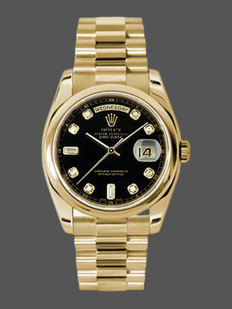 Rolex Day-Date 118208 Black Diamond Dial Yellow Gold case 36mm Unisex Replica Clone