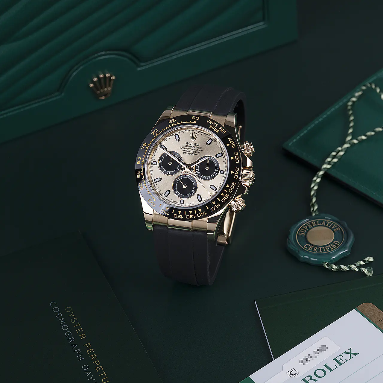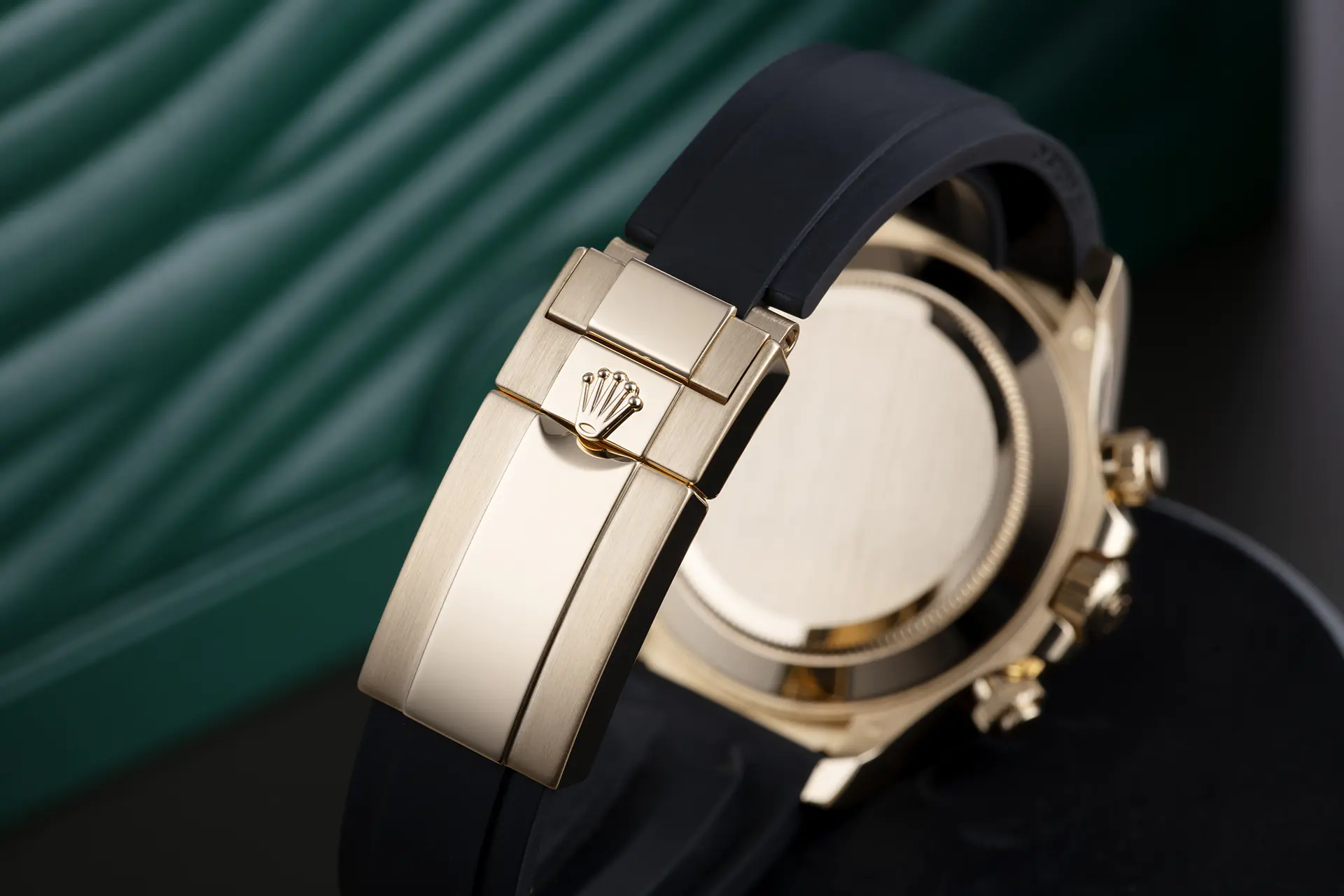 Rolex Daytona Cosmograph (116518LN) self - winding automatic watch, features a 40mm 18k yellow gold case with a black Cerachrom bezel surrounding a champagne dial on a black Oysterflex strap with a yellow gold deployant buckle.