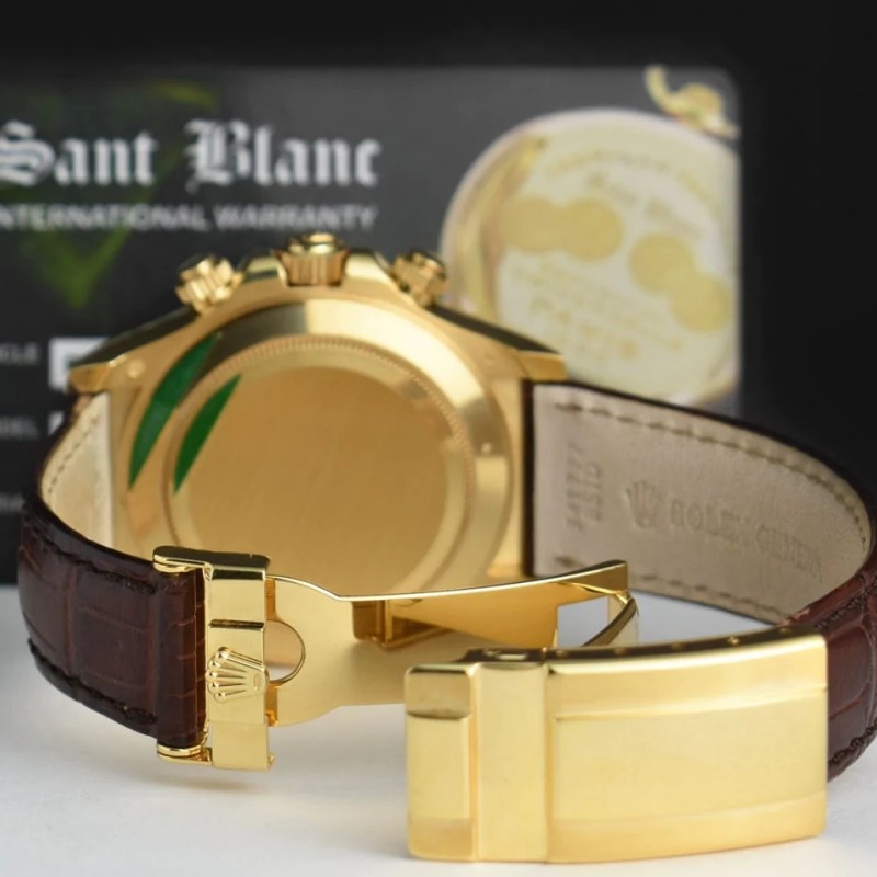Rolex Daytona 116518 Mother of Pearl Dial 40mm Mens Replica Watch.40.0 mm yellow gold case in diameter.Yellow gold tachymeter engraved bezel. Scratch resistant sapphire crystal. Mother of pearl dial with raised roman numerals. Small seconds hand at 6 o'clock. Centre chronograph hand, 30-minute counter at 3 o'clock and 12-hour counter at 9 o'clock. Brown leather strap with yellow gold deployent buckle.