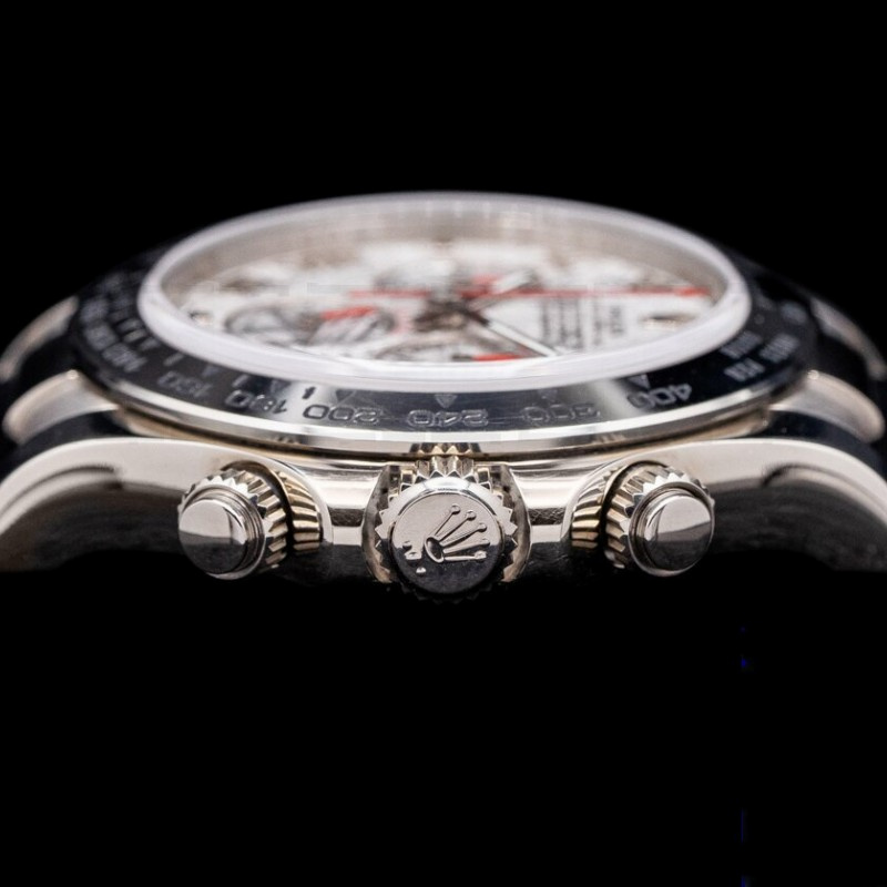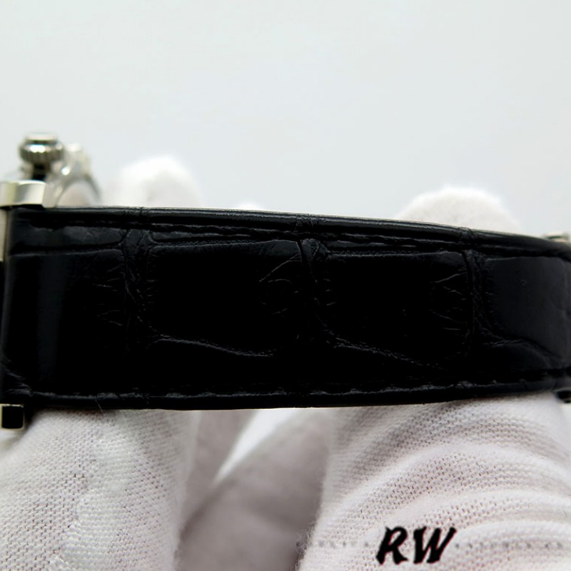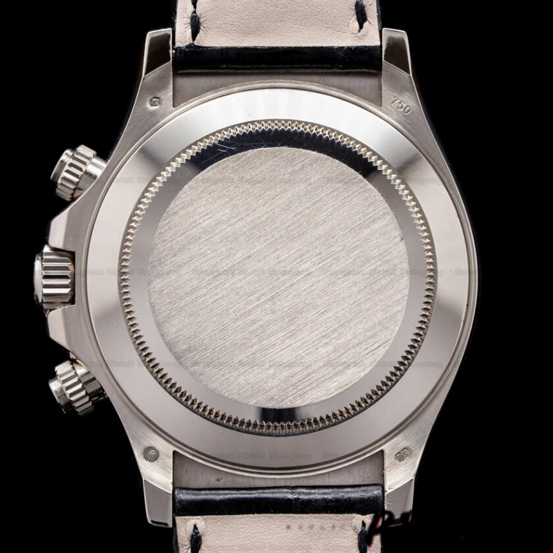 Rolex Daytona 116519 Black Leather strap Meteorite Dial 40mm Mens Replica Watch.The 40mm diameter solid three-body case, integral lugs, and angled bezel are polished/brushed.Meteorite dial with Roman numeral hour marker. 30 minute recorder at 3 0'clock, small seconds at 6 0'clock, 12 hour recorder at 9 0'clock, a fixed white gold polished tachymetre bezel, black leather strap with an brushed and polished white gold oysterlock deployant clasp, sapphire glass.