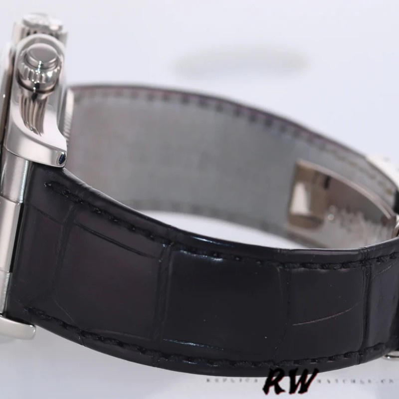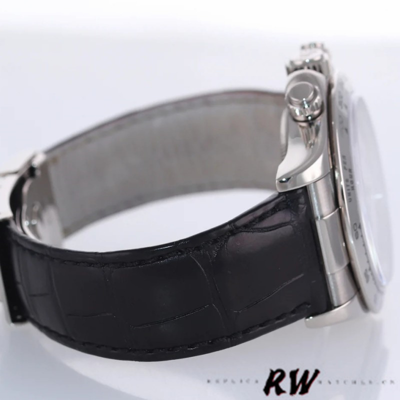 Rolex Daytona 116519 Mother of Pearl Arabic Dial 40mm Mens Replica Watch.40mm White Gold case,bezel, winder and deployant clasp, Mother of pearl dial with Arabic numeral hour markers. Minute markers around the outer rim. 30 minute recorder at 3 o'clock, 60 second recorder at 6 o'clock, 12 hour recorder at 9 o'clock,Black leather strap, sapphire crystal glass.