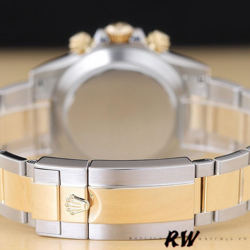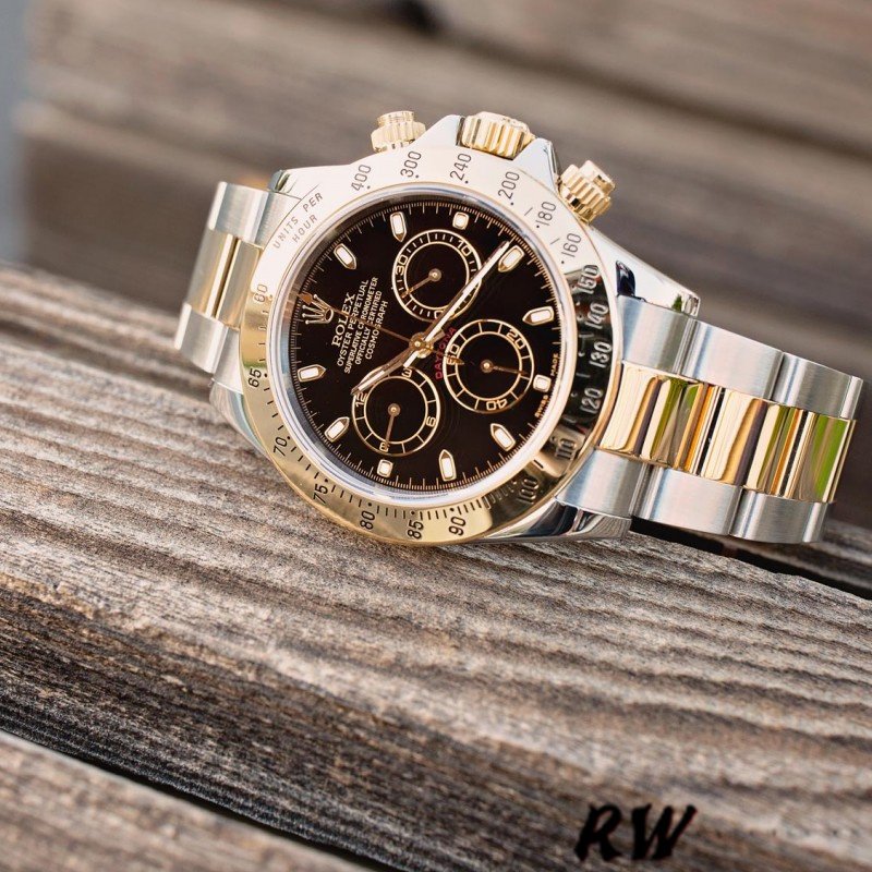 Rolex Daytona 116523 Stainless Steel Black Dial 40mm Mens Replica Watch.40mm Stainless Steel Case. The black dial with applied luminescent hour markers. The sub dials are matching black with gold borders and polished god hands.Yellow Gold and Stainless Steel Oyster Bracelet.Sapphire Crystal.The bracelet has eleven full size links and the fold over extension, comfortably fitting up to a 7.3-inch wrist.
