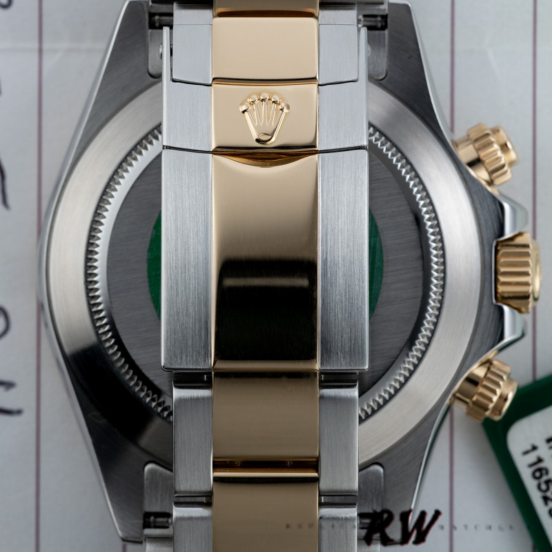 Rolex Daytona 116523 Stainless steel Chronograph Dial 40mm Mens Replica Watch has a Stainless Steel 40 mm Round Case with yellow gold tachymeter engraved bezel. Scratch resistant sapphire crystal. Features champagne dial with index hour markers,the 12-hour and 30-minute registers. Luminous yellow gold baton hands. Stainless Steel and Yellow Gold Oyster Bracelet with a Flip Lock extendable Deployment Clasp.