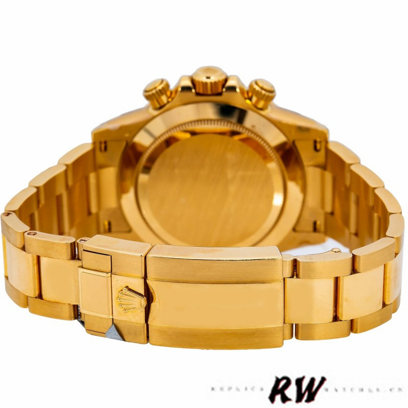 Rolex Daytona 116528 Black Dial Yellow Gold 40mm Mens Replica Watch has a Yellow Gold 40 mm Round Case with Screw Down Crown and a Yellow Gold Domed. and features a polished case and bezel.Black Dial with 3 Functional Sub Dials ,Seconds hand Sub dial at 6 O'Clock.The elegantly designed Yellow Gold with Folding Oysterlock Safety will look great on your wrist.